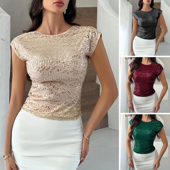 Стильная отделка пайетками: Дополните свой образ этим элегантным топом с короткими рукавами и изящной отделкой из пайеток, который без труда добавит вашему наряду нотку изысканности.