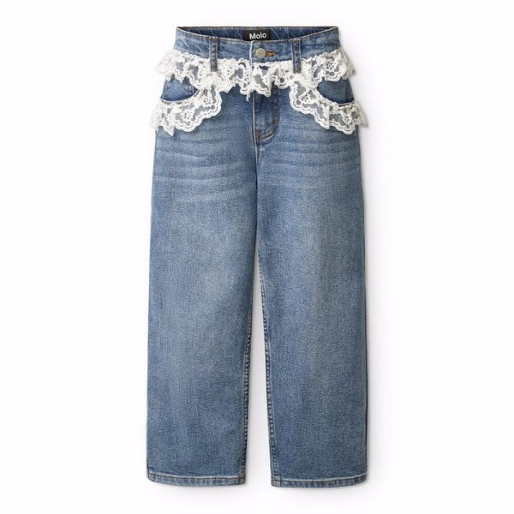 The Molo [26SS] Aiden Lace Straight Fit Pants for ages 5-8 are part of the 2026 Spring/Summer (26SS) collection, featuring a straight-fit design with lace details. Equipped with five pockets, they are made from denim fabric treated for a vintage feel in either blue wash or black wash.