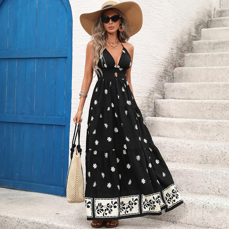 Новое летнее сексуальное пляжное платье в ретро-стиле с широкими рукавами и вырезом-халтер, с открытой спиной, без бретелек, с принтом, и пышной юбкой