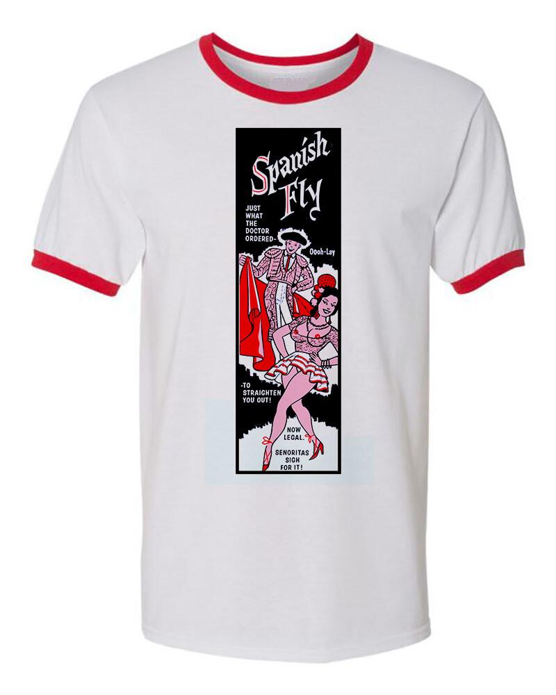 Унисекс Футболка с контрастными манжетами и воротником Хлопок Новинка 70-х Смешной Презерватив Ретро Испанская Муха Унисекс Футболка