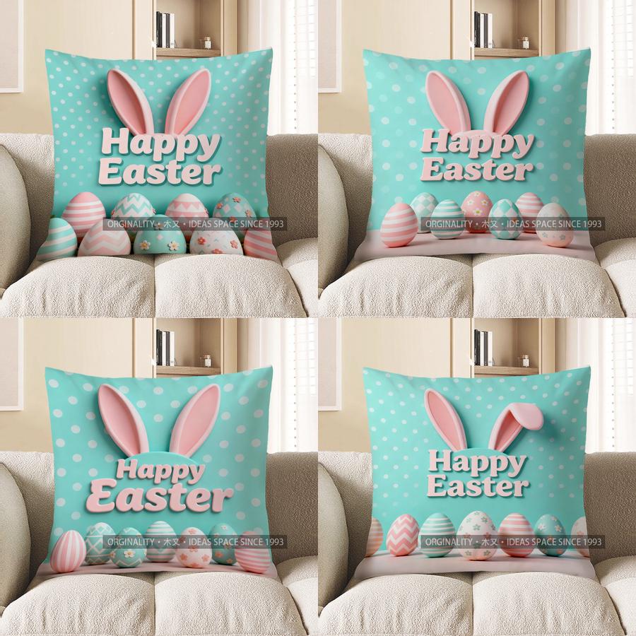 2D Happy Easter Bunny Ears And Decorative Eggs Pillow Pattern Cushion Cover Suitable For Sofa Bedroom Car Pillow Cover