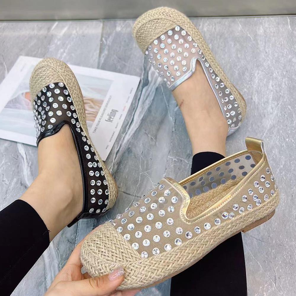 Модная женская обувь на плоской подошве Большого размера Сетчатые лоферы с горным хрусталем Женские лоферы Дизайнерские Летние женские туфли Повседневные женские сандалии
