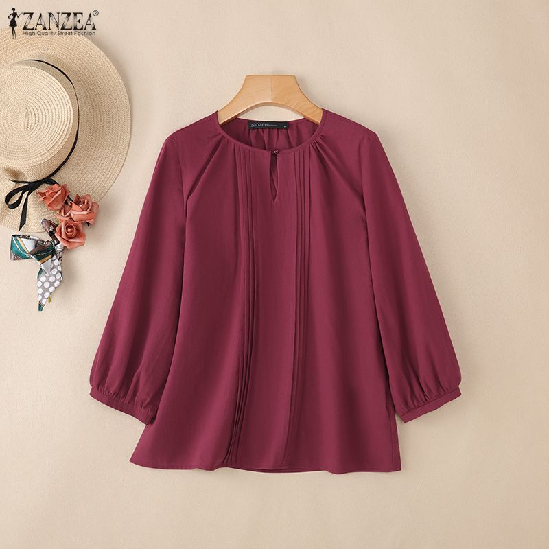 ZANZEA Женская повседневная блузка из хлопка с круглым вырезом и рукавом 3/4