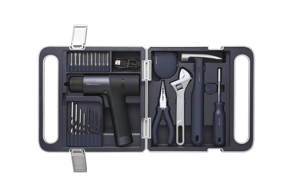 Боковая застежка / Многофункциональная отвертка / Молоток для гвоздей с резиновым бойком / Регулируемый разводной ключ / Самофиксирующаяся линейка / Длинногубцы / Бесщеточная дрель 12 В / 4 сверла по металлу и 4 сверла по дереву / 10 бит для отвертки из стали S2 / Универсальный дизайн