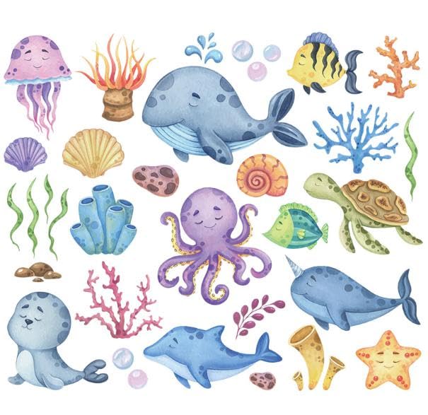 Этот яркий и красочный дизайн включает разнообразных морских обитателей, таких как дельфины, киты, акулы, осьминоги, морские звезды и другие.. Идеально подходит для детской спальни, игровой комнаты или ванной.