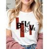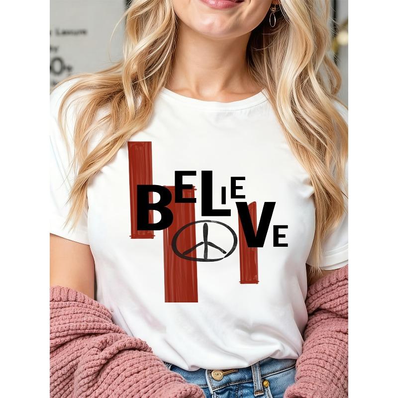 Европейский размер BELIEVE Текст Жирные Черные Буквы Красные Мазки Символ Мира Чистый Дизайн для Женщин Летняя Футболка с Коротким Рукавом с Принтом