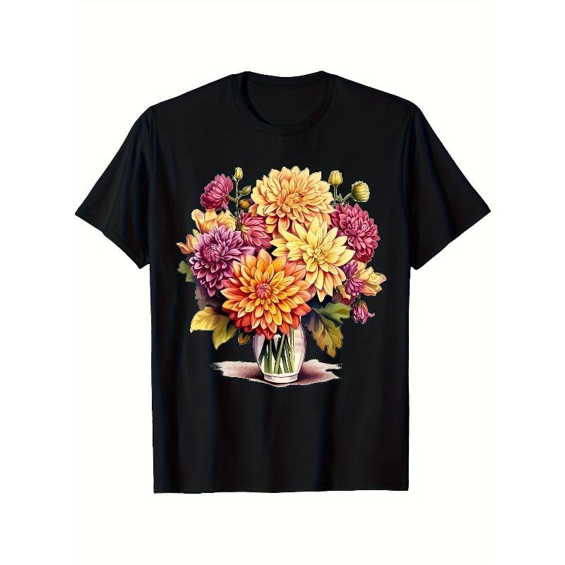 European Size Dahlia Flower Design T-Shirt for Women, Featuring a Single-Sided Print This Black Short-Sleeve Shirt Makes a Cheerful Easter Gift — купить товар онлайн с бесплатной доставкой по всему миру!