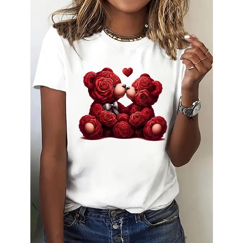 Европейский Размер Романтичная Мечтательная Милая Женская Футболка с Коротким Рукавом - Нежный Принт с Розой и Медведями для Пары, Легко Сочетающаяся Повседневная Футболка с Круглым Вырезом — купить товар онлайн с бесплатной доставкой по всему миру!