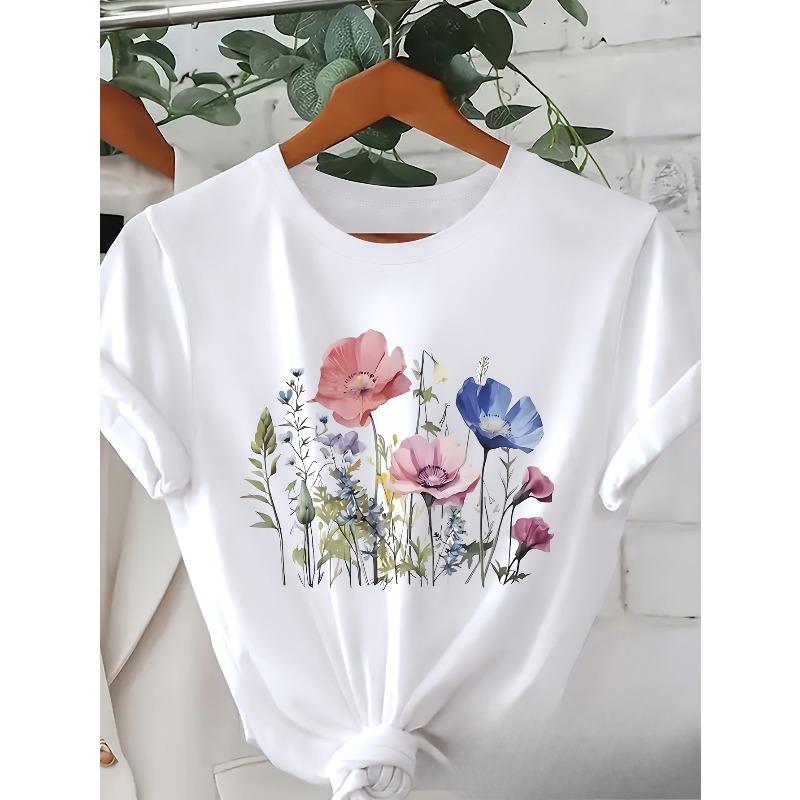 Европейские размеры 100% Блузка с коротким рукавом - Мягкая дышащая рубашка с круглым вырезом с ручной росписью, разноцветные цветы, подходит для повседневной носки