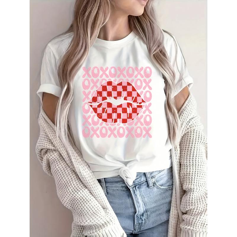 Европейский Размер Модный Повседневный Абстрактная Живопись Розовый XOXO Буквы Красные Губы Color Block Клетчатый Графический Дышащий С Принтом Круглый Вырез Короткий Рукав