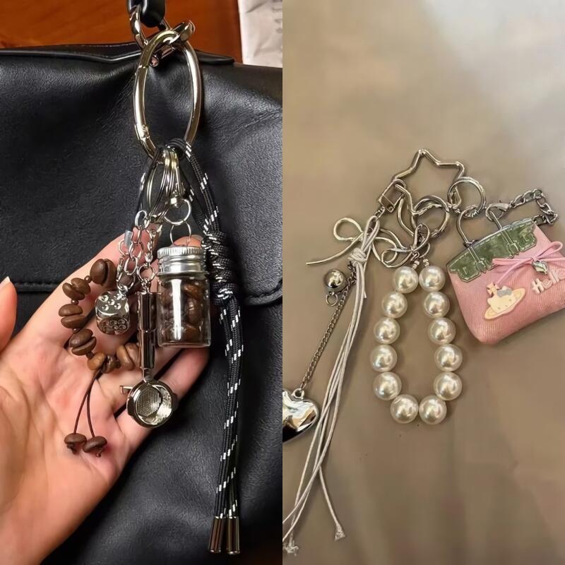 Kitsch Pearl Cat Coffee Bag Ornament Hook Keychain