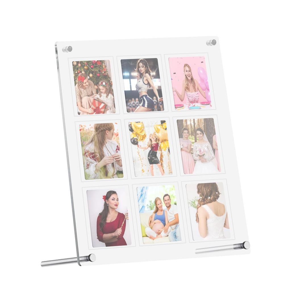 [Отображает до 9 фотографий]: Эта акриловая подставка вмещает до 9 фотографий или коллекционных карточек размером 3 дюйма.. Его можно разместить горизонтально или вертикально на столешнице.. Разместите 9 ваших любимых фотографий и держите их на виду постоянно.