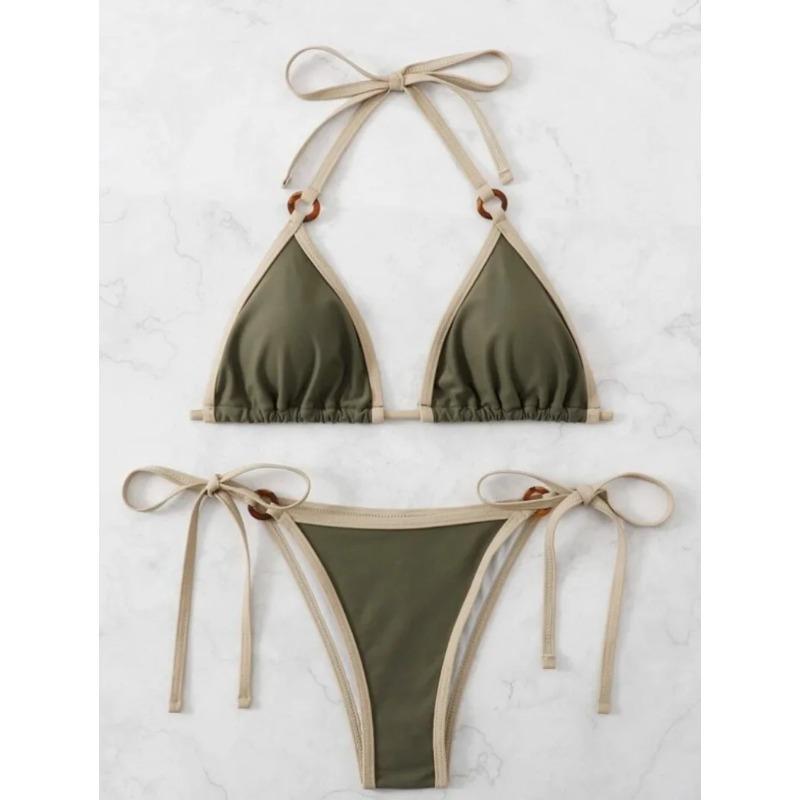 Женские зеленые комплекты бикини на завязках с микрокольцами, двухсекционные, с завязками-стрингами, купальники, пляжная одежда, бикини
