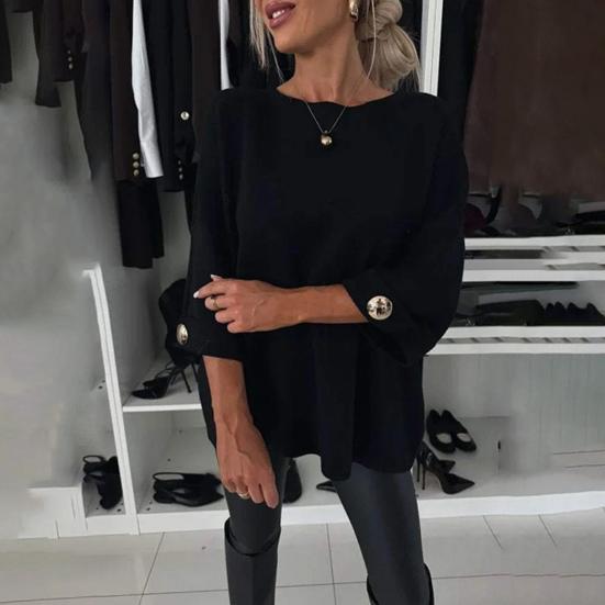 Функциональные детали: Этот топ с круглым вырезом, длинными рукавами и манжетами, украшенными яркими пуговицами, сочетает в себе простоту и повседневную изысканность, создавая непринужденный образ.