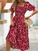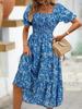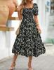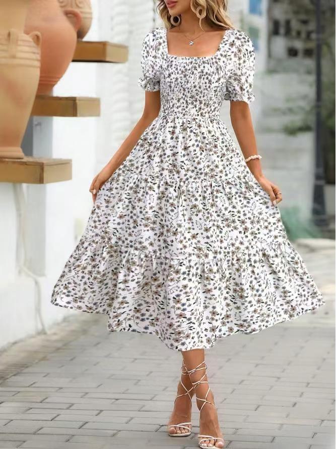 Европейско-американское женское платье с принтом, коротким рукавом, квадратным вырезом, пышными рукавами, многослойное