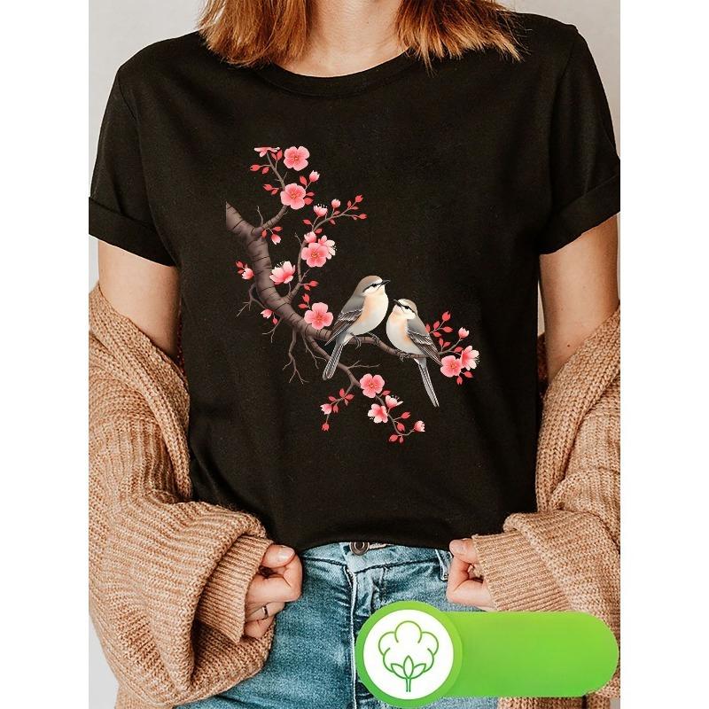 Женская футболка с принтом «Толстые птицы и цветение вишни», круглый вырез, короткий рукав, весна-лето, легкая, повседневная, игривая, комфортная — купить товар онлайн с бесплатной доставкой по всему миру!