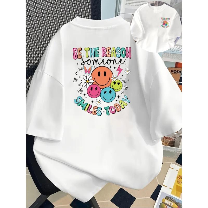 Женская футболка с принтом 'Улыбающееся лицо' и позитивной энергией, с круглым вырезом, коротким рукавом, дизайн с сердечками, весенний повседневный, игривый, модный топ