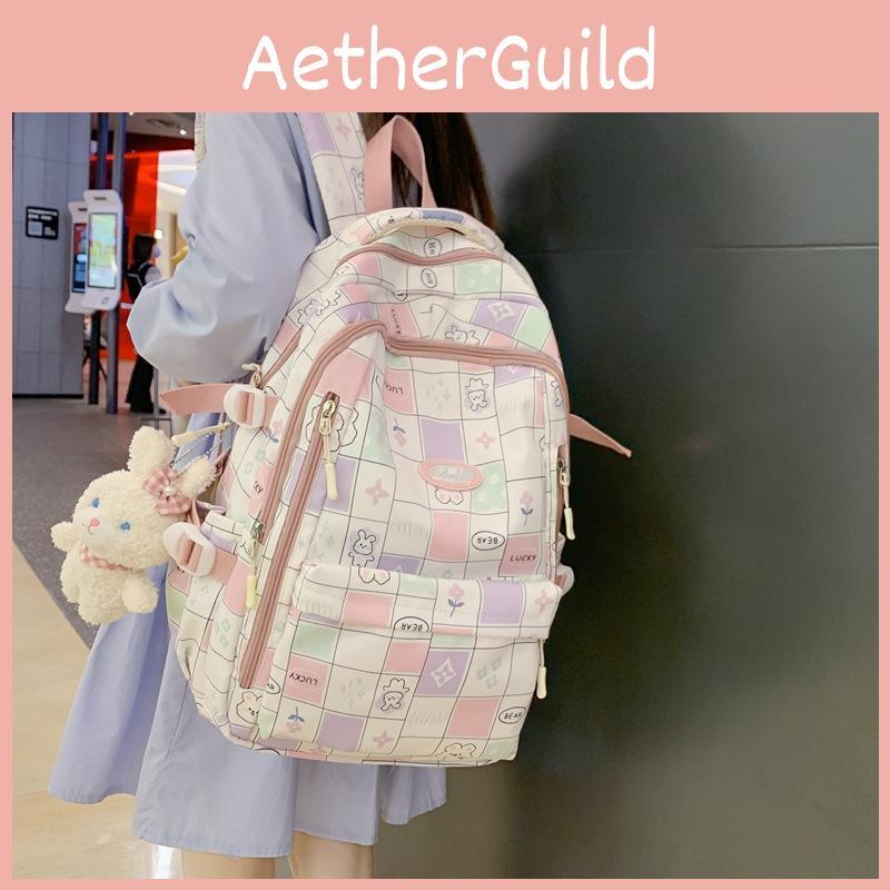 Ins Style Girls' Nylon Large Capacity Backpack For School Students Cartoon Cute Flower Pattern Grid Element
