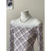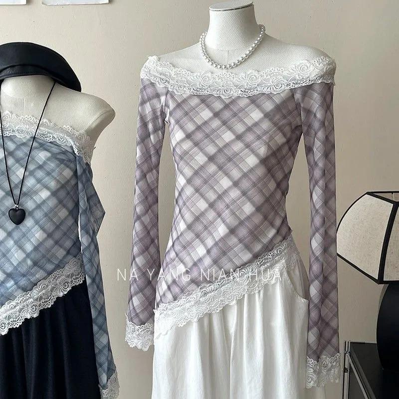 Французская однотонная рубашка с косым вырезом, открытыми плечами, двумя способами носки, в клетку, солнцезащитная, для женщин, осень, с кружевной отделкой, футболка, топ
