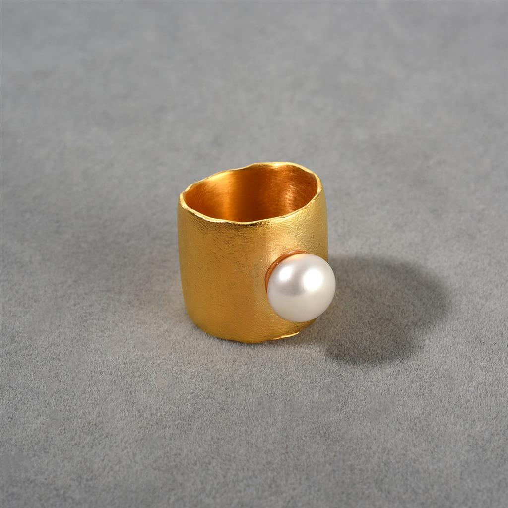 Модное Нишевое Дизайн Широкая Версия Позолоченное 18K Настоящим Золотом Инкрустированное Натуральной Жемчужиной Кольцо Персонализированное Кольцо Женское