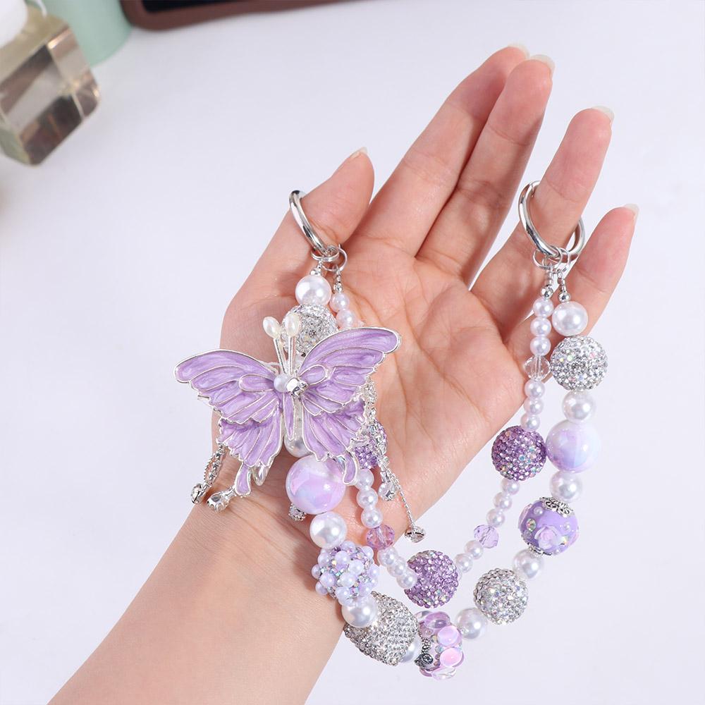 Glitter Butterfly Key Chain Double Layer Beads Bag Pendant Rhinestone Phone Chain Backpack Pendant