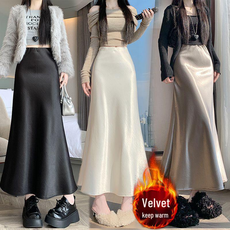 2025 Autumn High-Waisted Plus Velvet A-Line Skirt - Double-Layered Wave Polyester Fabric, Simple OL Commuting Style — купить товар онлайн с бесплатной доставкой по всему миру!