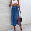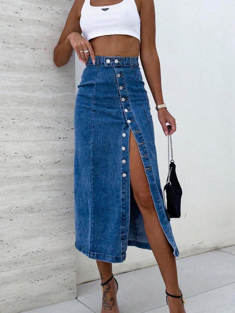 Представляем уникальное дополнение к вашему гардеробу: эта асимметричная юбка-миди на пуговицах со разрезом создана для того, чтобы предложить и стиль, и комфорт.. Изготовлено из прочного денима, демонстрирует однотонный узор со спортивным оттенком.. Юбка украшена стильной стеганой отделкой, добавляющей изысканности общему дизайну.. Идеально подходит для создания современного и динамичного образа, эта вещь безупречно сочетает в себе европейские и американские модные влияния, что делает ее идеальным выбором для весеннего сезона.