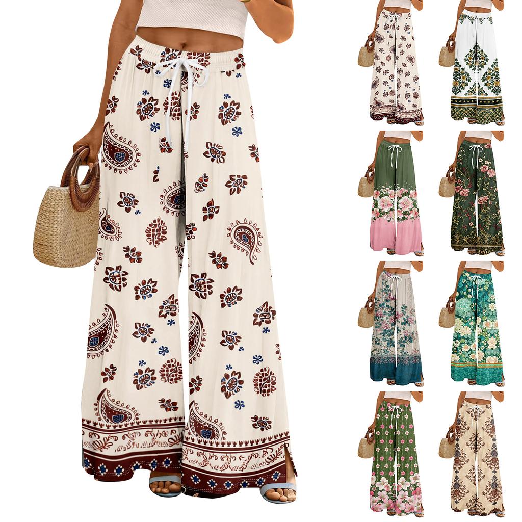 Женские летние брюки-палаццо в стиле бохо с высокой талией, широкие повседневные брюки с цветочным принтом и карманами — купить товар онлайн с бесплатной доставкой по всему миру!