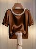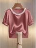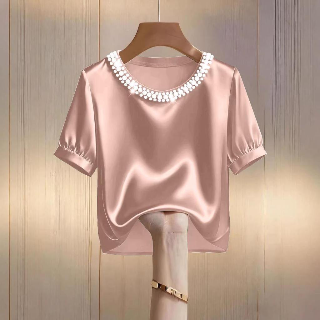 Эта элегантная футболка с короткими рукавами сочетает в себе вневременной стиль и современный шик, отличаясь шикарным жемчужным воротником и классическим круглым вырезом.. Изготовлен из роскошного атласа, он обеспечивает гладкую и удобную посадку, идеально подходящую для летней моды.. Однотонный узор позволяет легко сочетать его с различными нарядами, а утонченный дизайн делает его универсальным элементом как для повседневной, так и для более официальной одежды.