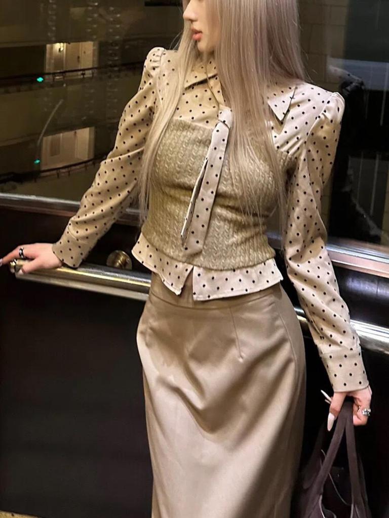 Этот стильный комплект состоит из шикарного вязаного топа в горошек, элегантно сочетающегося с винтажной длинной юбкой А-силуэта. Оба изделия изготовлены из высококачественного полиэстера.. Идеально подходит для повседневной прогулки, этот наряд легко сочетает в себе комфорт и моду, что делает его универсальным дополнением к любому гардеробу.