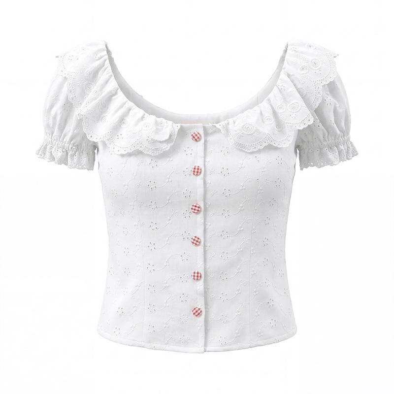 Белая рубашка с кружевным воротником и пышными рукавами - Женский ретро топ на пуговицах с вышивкой и акцентом на талии