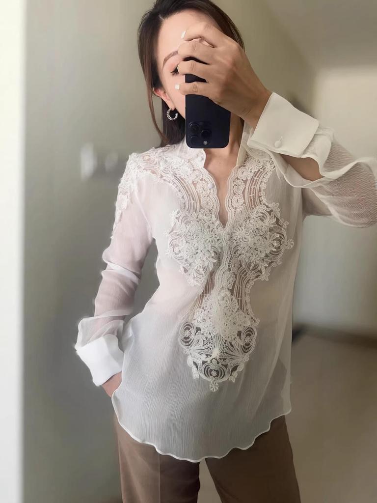 Эта изысканная блузка изготовлена из роскошного шелка-тусса, обеспечивая гладкое и мягкое ощущение.. Он отличается элегантным кружевным комбинированным дизайном, который подчеркивает его утонченное очарование.. Блузка сшита с длинными рукавами и выгодно подчеркивающим V-образным вырезом, что добавляет ей стильный силуэт.. Благодаря сплошному узору и изысканной вышивке, это идеальный выбор, чтобы добавить нотку изящества и элегантности в ваш гардероб.