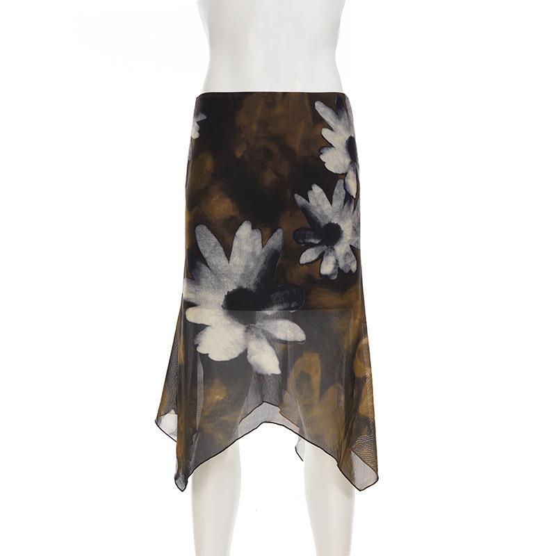 Американская ретро цветочная сетчатая неровная юбка с низкой талией для отпуска