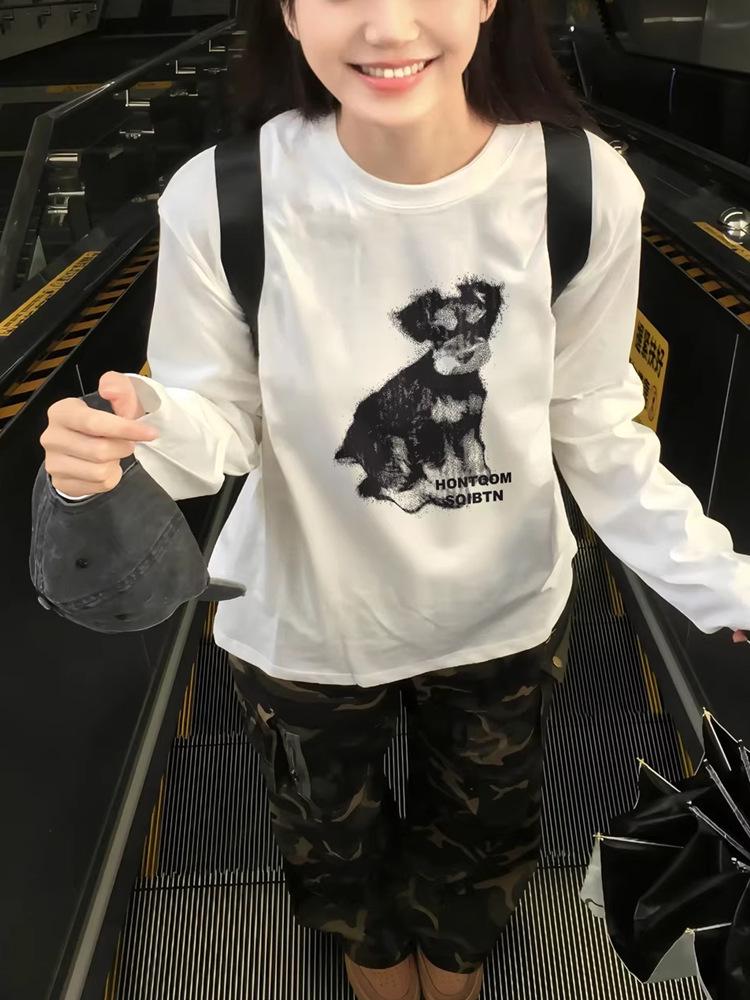 Women's Versatile White Cotton Long Sleeve Puppy Cartoon T-Shirt