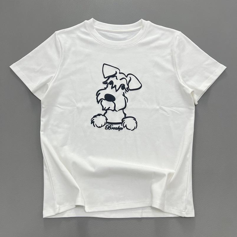 Women's White Round Neck Puppy Print T-Shirt - Short Sleeve, Loose, Versatile, Slimming Top for Spring/Summer