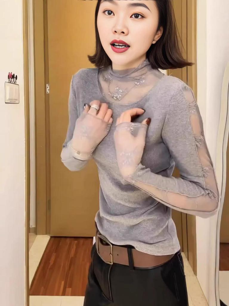 Women's Gray Lace Patchwork High Neck Long Sleeve T-shirt – Stylish Winter 2026 Base Layer
