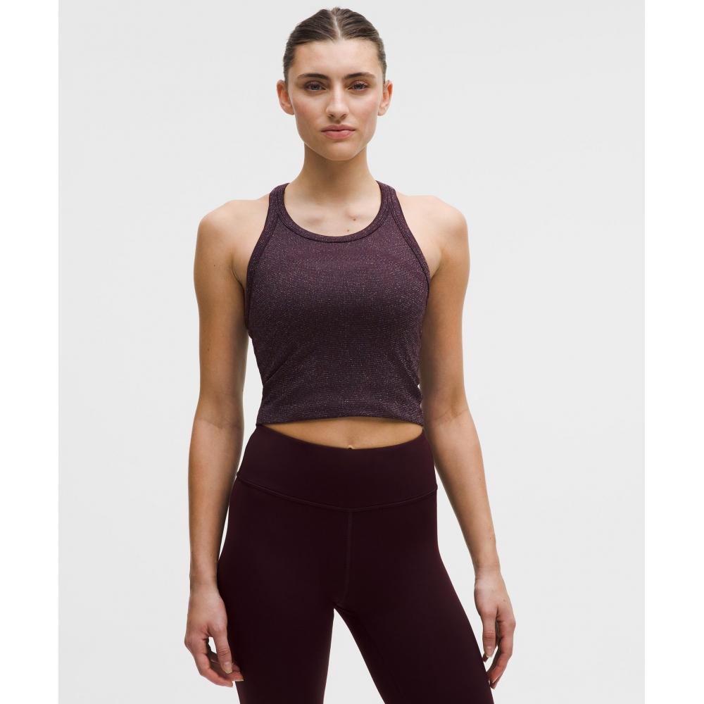 Go ahead, get glowing. This version of our high-performing Swiftly top features colourful metallic yarns that complement your post-workout glow.