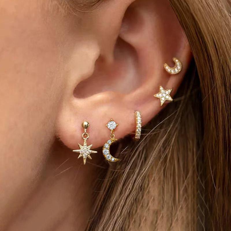 5PCS New Design Gold Color Ear Stud Earring Set For Women Zircon Star Moon Punk Piercing Earrings Helix Tragus Piercing Jewelry