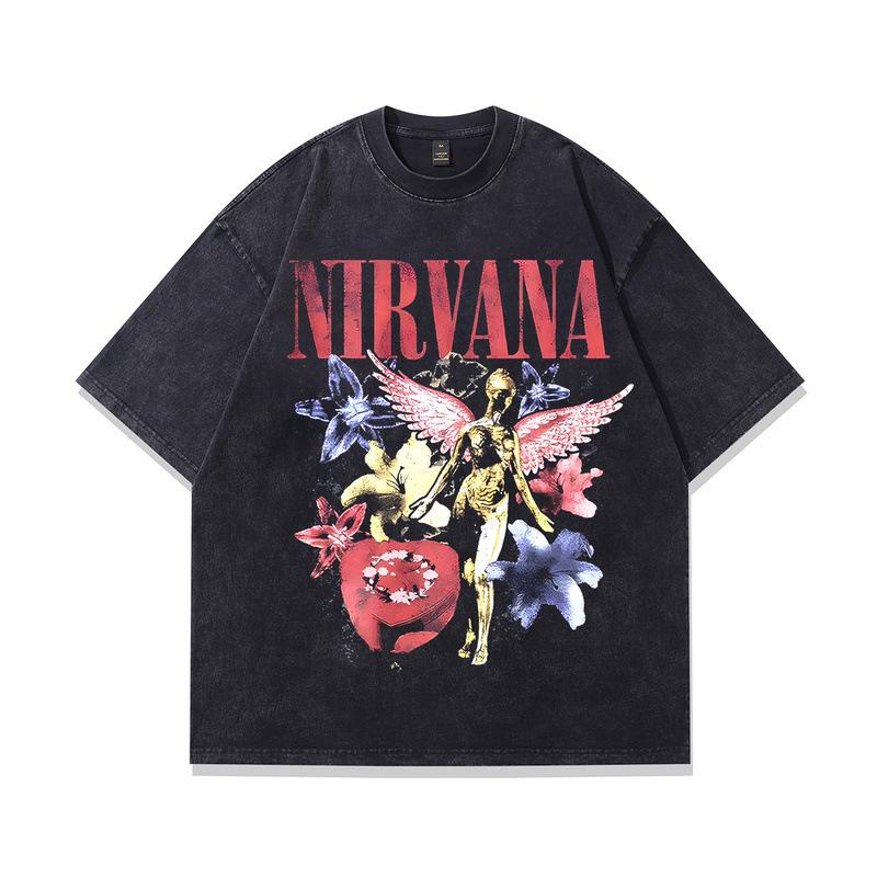 Men'S Pure Cotton T-Shirt European And American High Street Vintage Washed Nirvana Band Printed Short-Sleeved T-Shirt Men