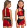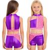 Блестящий костюм для выступлений со стразами для девочек: Металлический кроп-топ с цветовыми блоками и matching эластичные шорты для сцены