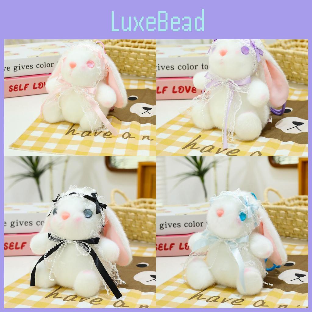 This plush bunny keychain features a soft, high-quality polyester fiber construction with a delicate lace design, It includes a pearl necklace and a bow, providing a charming accessory for backpacks or bags. Ideal for daily use, it adds a cute touch to casual settings. Wipe clean with a damp cloth to maintain its appearance.