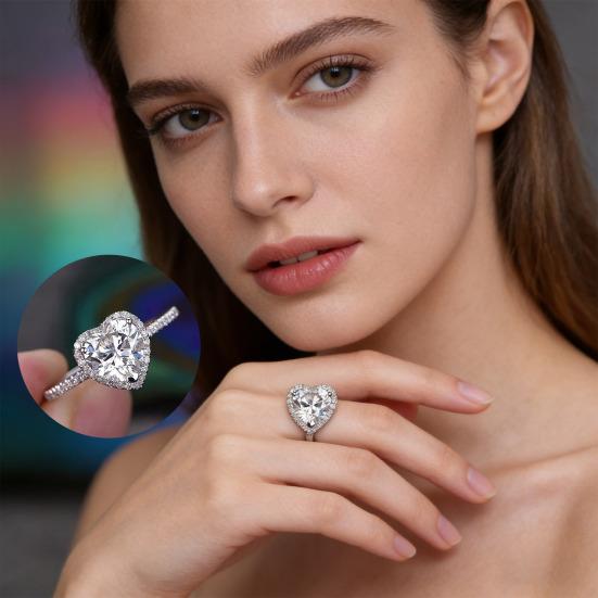 Это элегантное кольцо имеет очень полированное металлическое кольцо с гладкими линиями, украшенное крошечными стразами по выступающим бокам для роскошного завершения.. В его центре находится ослепительный кубический цирконий в форме сердца, символизирующий любовь и романтику, окруженный кругом сверкающих страз, которые усиливают его блеск и визуальное воздействие..