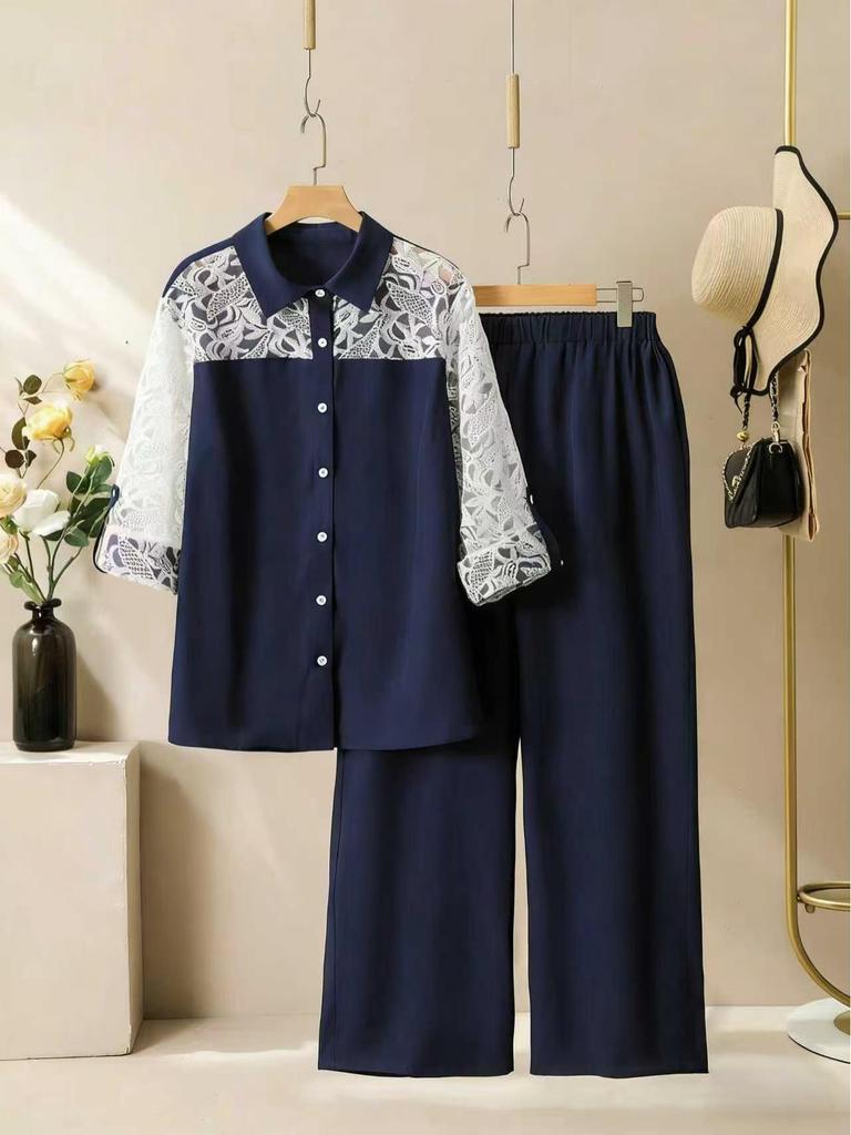 Откройте для себя элегантность и комфорт с этим шикарным комплектом из двух предметов, включающим рубашку с длинным рукавом и брюки клеш.. Комплект изготовлен из высококачественного полиэстера, что обеспечивает мягкую и дышащую посадку.. Рубашка украшена нежным кружевным пэчворком, добавляющим нотку женского очарования.. Идеальный для любого случая, этот комплект легко сочетает в себе стиль и свободу движений, что делает его незаменимым дополнением к вашему гардеробу.