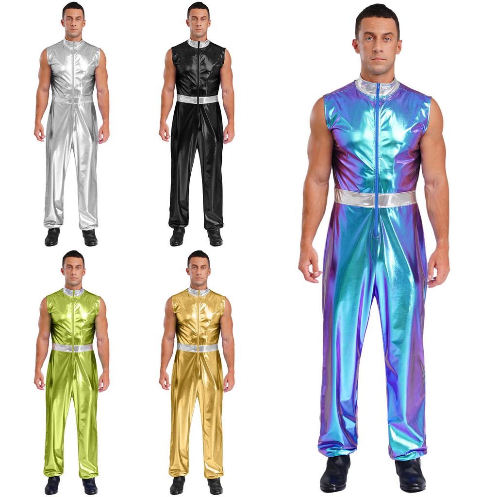 Mens Shiny Metallic Sleeveless Full Length Zipper Jumpsuit Bodysuit — купить товар онлайн с бесплатной доставкой по всему миру!