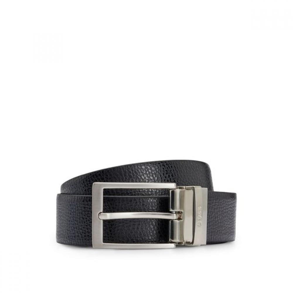 [SP26] Реверсивный ремень из структурированной итальянской кожи Черный (50447116002) универсальный предмет, подходящий для различных образов. Изготовлено из высококачественной итальянской кожи, прочное, с фурнитурой из матового серебра и деталями с логотипом.. Материалы, используемые в этом продукте, состоят как минимум на 80% из сертифицированной кожи.