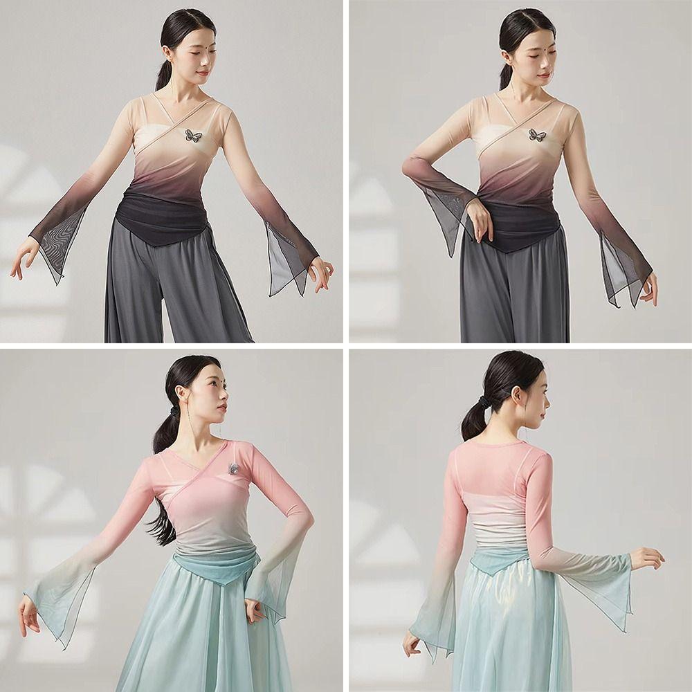 Chinese Hanfu Saree Blouse Gradient Dance Mesh Top Fashion Performance Training Costumes Women — купить товар онлайн с бесплатной доставкой по всему миру!