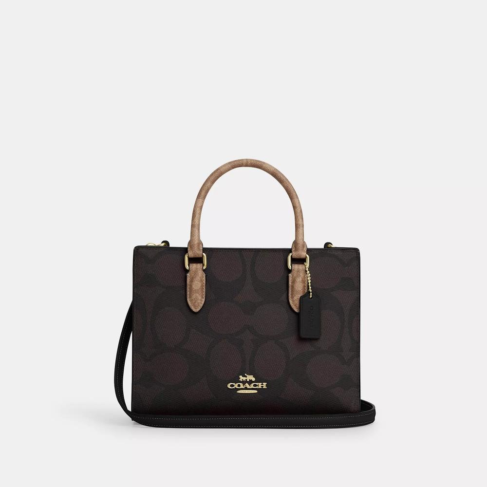 Coach Maggie Small Tote Bag In Blocked Signature Canvas Gold Walnut Tan