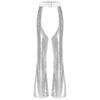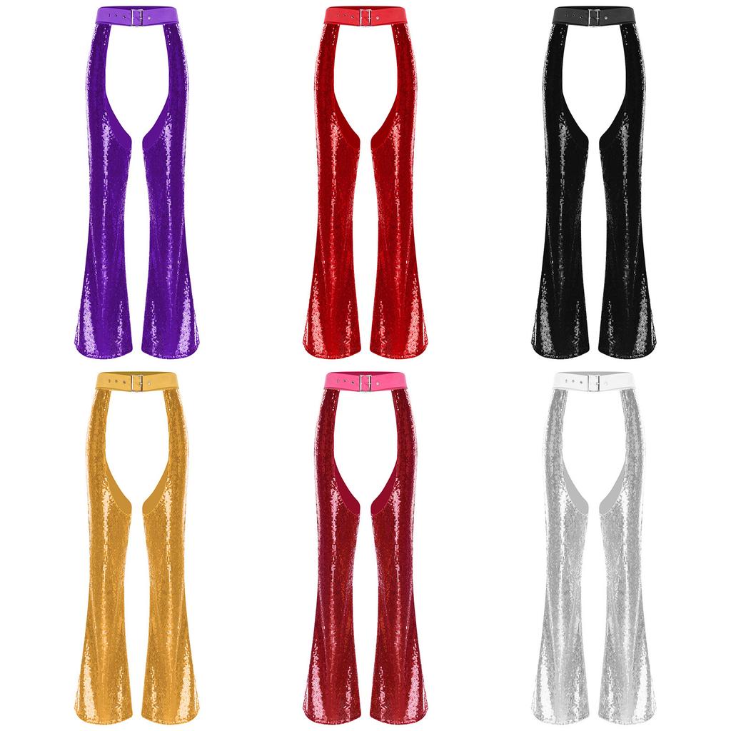 Womens Halloween Glitter Sequin Cowgirl Chaps Adjustable Waist Crotch Hollow Out Fully Lined Flared Pants