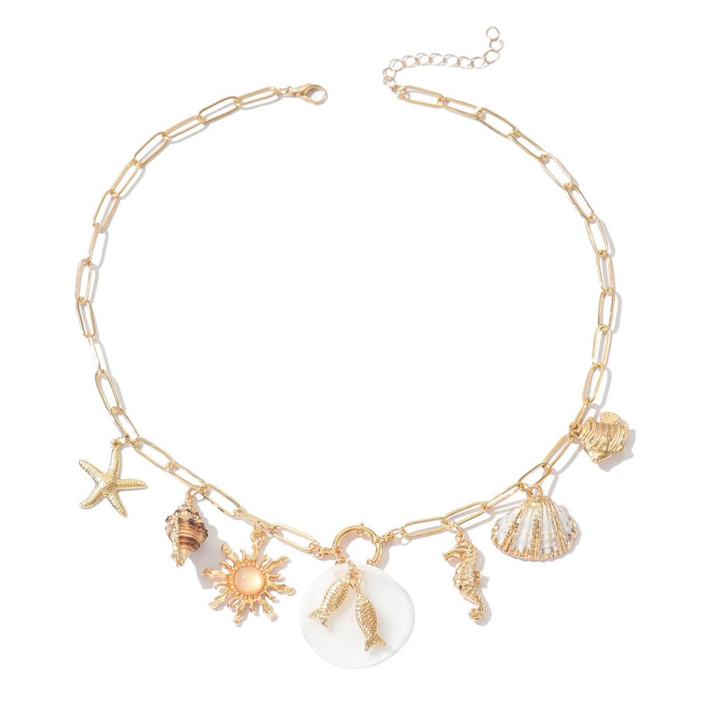 Это регулируемое ожерелье выполнено в морском стиле с подвесками в виде ракушек, морских звезд и морских коньков, изготовленными из прочного сплава с цинковым покрытием, что обеспечивает комфортное ношение.. Идеально подходит для пляжного отдыха, летних фестивалей или повседневной носки, добавляет естественный, модный штрих. Протирайте мягкой тканью для поддержания блеска.