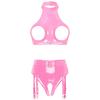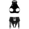Womens Patent Leather Halter Open Bust Backless Crop Top Garter Underwear Set